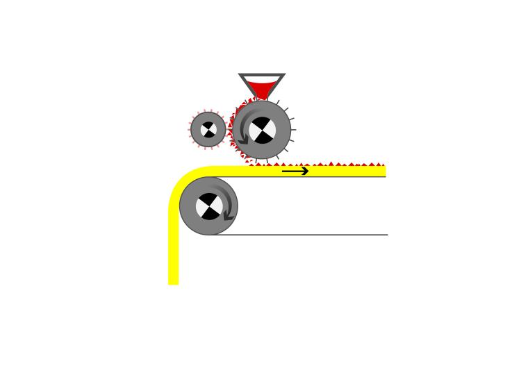 Das thermoplastische Schmelzklebepulver wird gleichmäßig aufgestreut und mit Druck und Temperatur auf der Oberfläche fixiert. Auch temperaturempfindliche Materialien können auf diese Art schonend beschichtet werden; Kaschierungen sind möglich; Warenbreiten von 1,20 bis max. 1,70 m. Basis der Schmelzklebstoffe: CoPA, CoPES, EVA, TPU, PE.