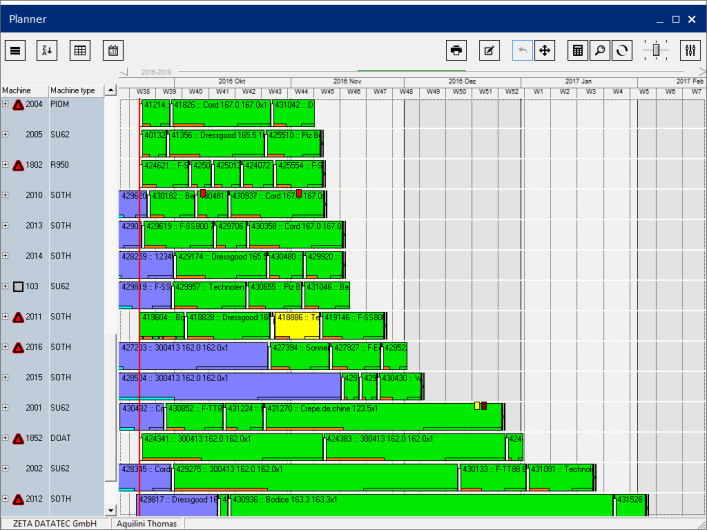 - Grafische Auftragsverfolgung mit Abhängigkeiten zur Weberei-Vorbereitung.