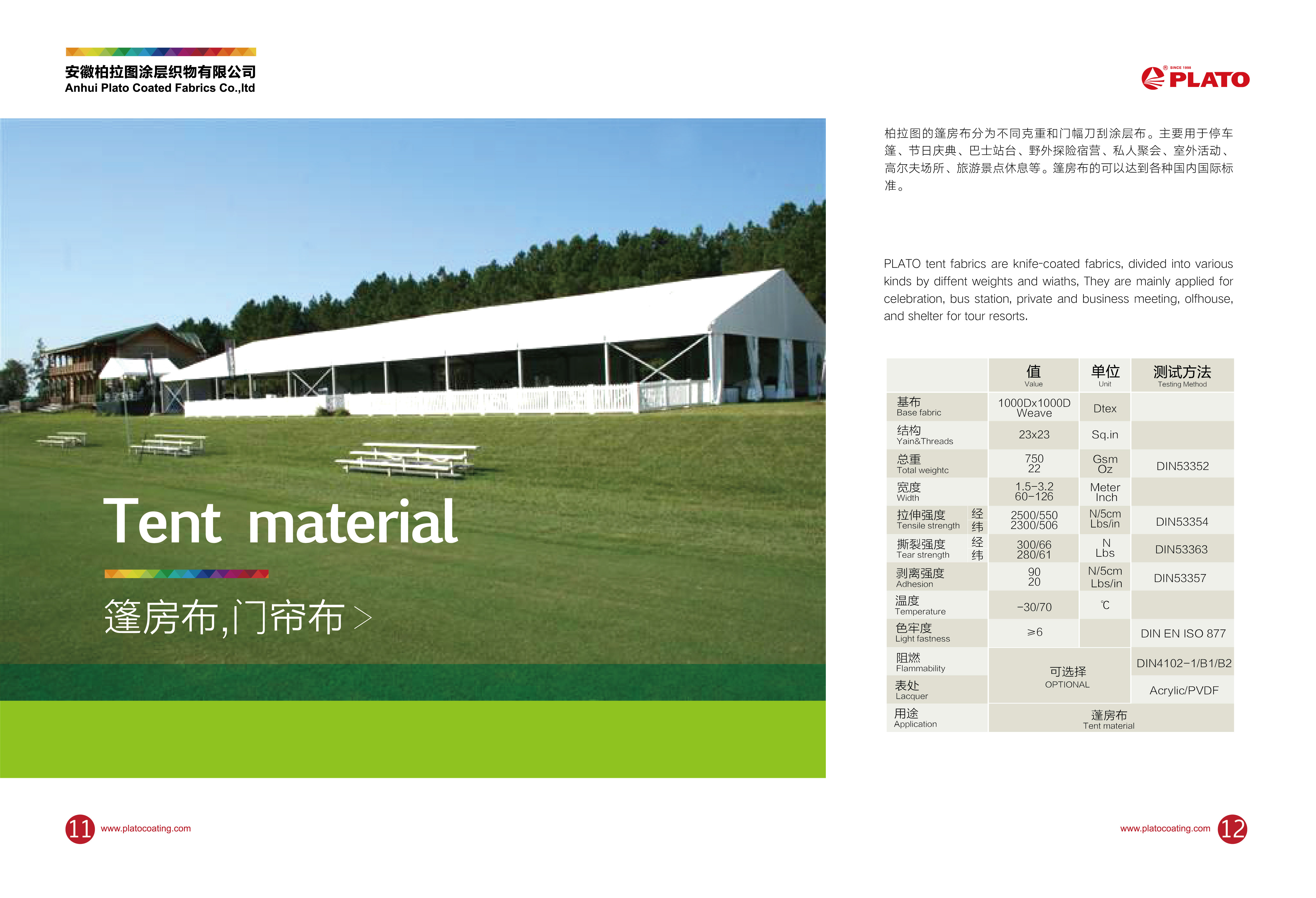 SINCE 2018, THE TENT FABRIC PRODUCED BY PLATO. HAS BEEN GREATLY IMPROVED IN THE SURFACE FLATNESS, LACQUERING AND BLOCK OUT EFFECT, WITH THE LEADING LEVEL IN CHINA. WIDELY USED IN LARGE-SCALE STORES, MOBILE WINE TENTS, FACTORY STORAGE AND OTHER FIELDSl