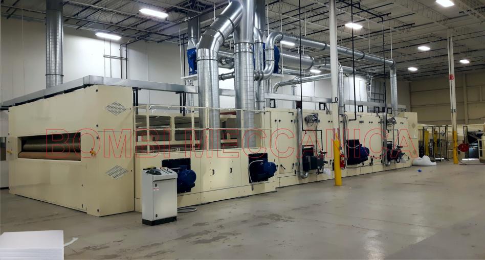 Re-designed and improved, the new thermobonding oven finds its application for all products : Natural fibers webs with high thickness, polyester wadding high loft, technical products, wood fibers, any kind of recycled fibers. Ventilation is forced from top to bottom or bottom to top, reversible in each section. Lateral closing of the air, from control panel. Heating with industrial direct gas burners, or electric, or diesel or hybrid. Thermal cycle at high efficiency. Modular construction for production up to 7.000 kg/h, weight up to 15 Kg/m2. Working width up to 6.5m. Speed up to 150 m\min
