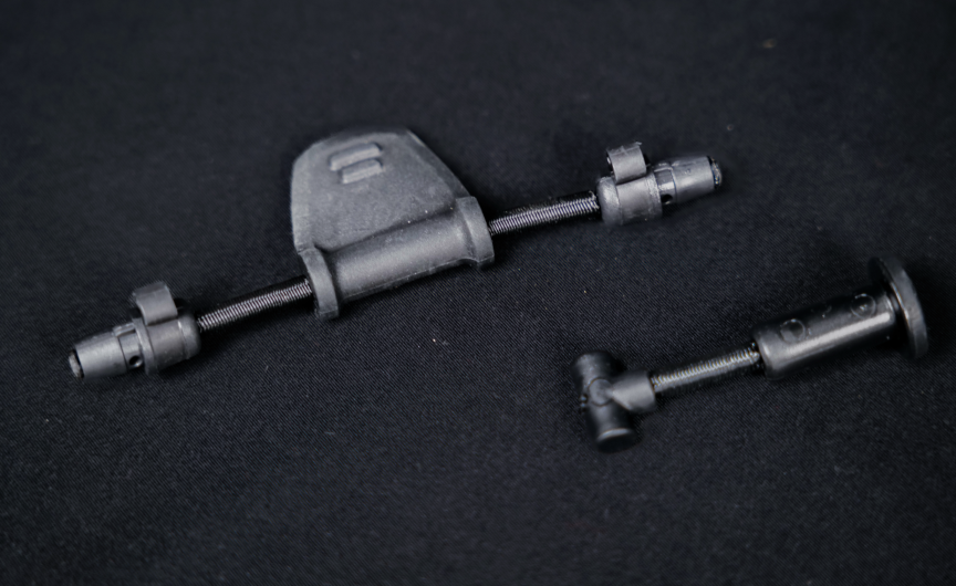 Dieses Teil beispielsweise besteht aus vier verschiedenen umspritzten Materialien. Der Strang besteht aus Latex und Polyester und wird anschließend mit PA6,6 und EPDM umspritzt.
