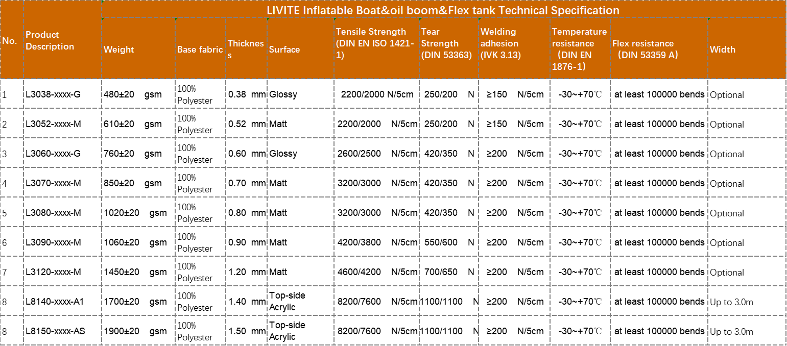 LIVITE Liquid Storage Material can be wildly used for made Inflatable Boat,PVC Airtight Inflatable Boat ,Inflatable Flexi Tank ,Inflatable Water Storage Tank,Inflatable castles (closed inflatable trampolines, bouncy houses, bouncy castles, inflatable slider ,ect). Liquid Storage Material is a kind of PVC Coated Fabric produce by semi-coated machine with high strength scrim reinforced. Scrim is warp knitted fabric or woven fabric which can be made out of fiberglass, nylon, polyester, or a combination.