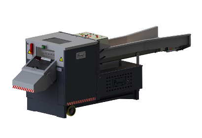 Reinforced guillotine cutting machine for special fibers.