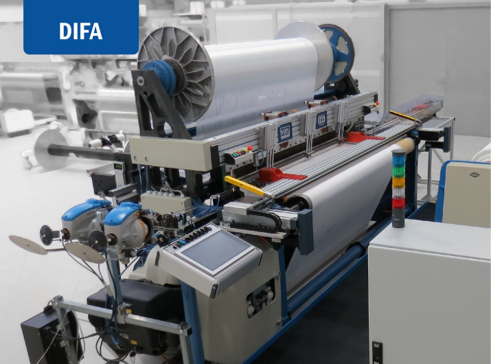 The DIFA air jet weaving machine represents a new dimension in weaving. It is designed for the industrial production of 3D distance fabrics (drop stitch / double-wall fabric ). The variable distance fabric (DIFA = DIstance FAbric) is a basic design component especially for inflatable systems, applications and products in various industries. Variable distance fabric increases the final product's stiffness, durability and structural strength at the same time as shape and dimensional variability variability (distance fabric, dropstitch, double-wall fabric, 3D fabric, component for infaltable systems).
